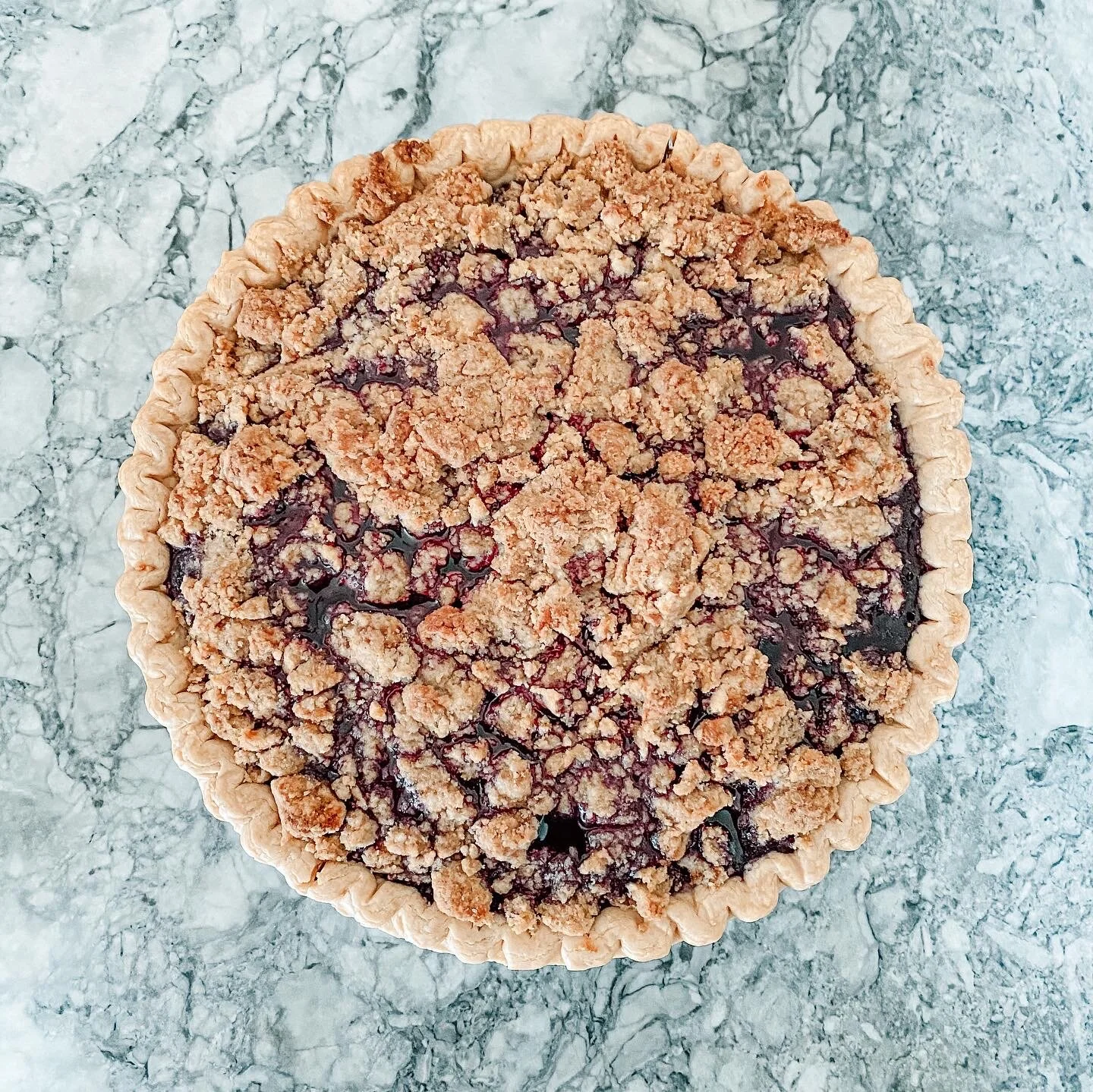 - Bake the pie for about 1 hour or until you notice the crumbs beginning to become golden brown and the blueberry filing bubbling.